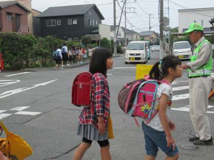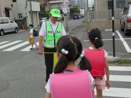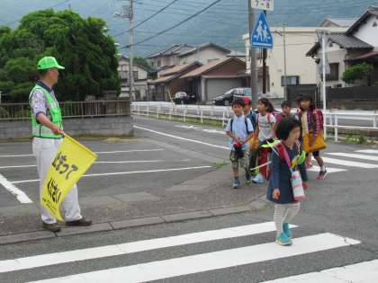 四小の子どもたちは、たくさんの大人の皆さんに見守られて、今朝も元気に登校しました。
