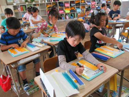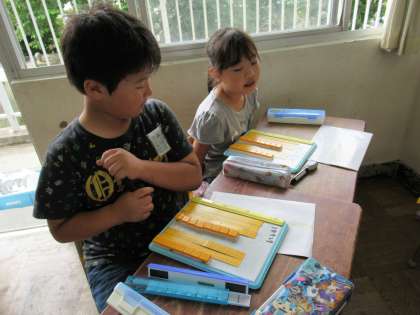 算数で、ブロックを使って学習していました。繰り上がりのある計算を、具体物の操作を通じて学んでいきます。