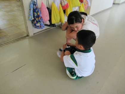 ちょっとご機嫌ななめの1年生。「どうしたの? 給食おいしいよ。教室に入ろうね。」と、6年生が優しく声をかけてくれました。