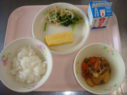 今日の給食は「ご飯・肉じゃが・厚焼き卵・小松菜ともやしのおひたし・牛乳」でした。