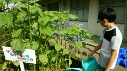 人権のヒマワリが、ずいぶん大きくなりました。福祉委員さんのおかげです。一年生のアサガオも、花盛りです。