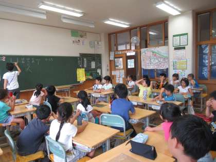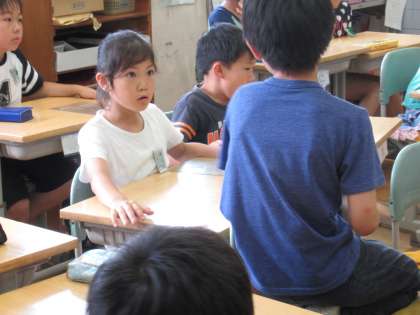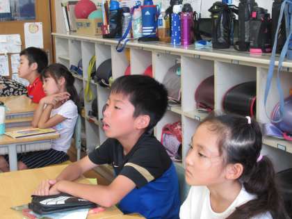 漢字テストをします。とめ、はね、はらい。細かいところにも気をつけて正しく覚えていきます。先生の説明をくいいるようにして聴いていました。中には、机の上に指で書いて確かめつつ聴いている子もいました。