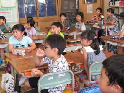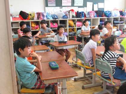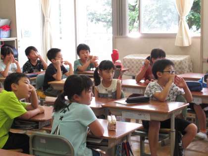 学習の振り返りをします。先生が振り返りの視点を説明してくれたので、こんなに真剣な表情で聴いていました。