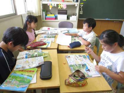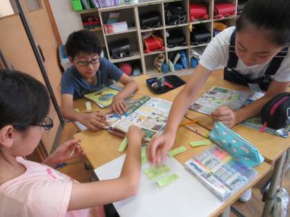 各自が気づいたことを付箋に書き、それをもとにして班で討論していました。みんなで学ぶ社会科です。