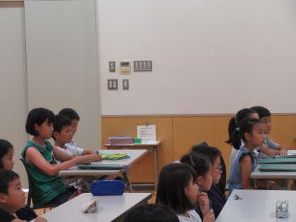 2グループにわかれて、座学と実習で安全な自転車の乗り方を学んでいます。座学では、子どもたちの真剣な目が印象的です。