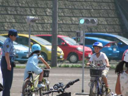 校庭には信号機も備えた道路が描かれ、実際に様々な場面での自転車の乗り方を学びました。