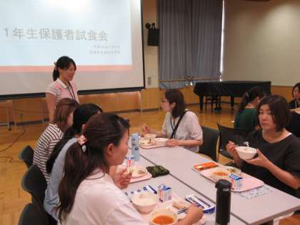 1年学年主任から給食指導の方針や具体を説明し、栄養教諭からは学校給食の目的や実態、四小給食室の紹介などを行いました。