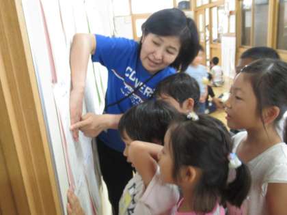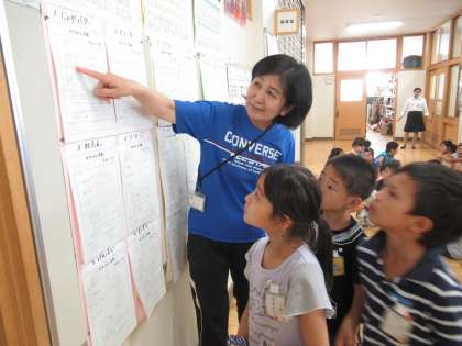 今日のロング昼休みには、なかよし遊びがあります。各班の6年生が計画を立て、掲示板に遊びの内容・集合場所・持ち物などを掲示してくれました。1年生は、掲示板を見て、なかよし遊びにのぞみます。