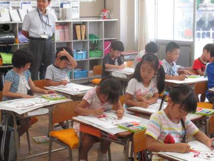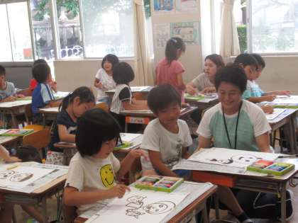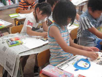 1年生は、絵を描いていました。かわいいネコやイヌがいたり、鮮やかな色づかいだったりして、見ていて楽しくなりました。