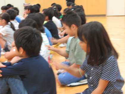 4年生は、指で背中にアルファベットを書いて伝えていく、伝言ゲームを楽しみました。