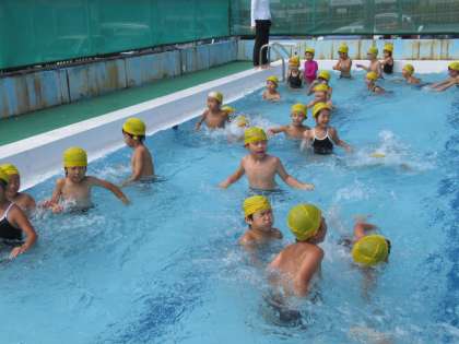2学級合同の体育です。1年生のプールでの学習は、水遊び。水に慣れるために、人間洗濯機をしていました。