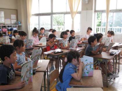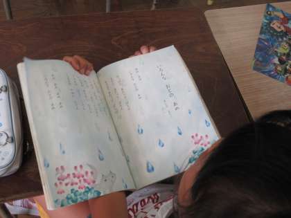 「いろんな おとの あめ」という詩を読みました。当たる物によって雨粒が違う音を立てることを、楽しんでいました。