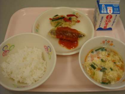 今日の給食は「ご飯・ホキのチリソースかけ・キャベツとパプリカの炒め物・卵と野菜のスープ・牛乳」でした。