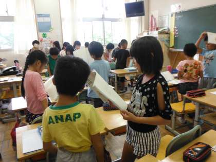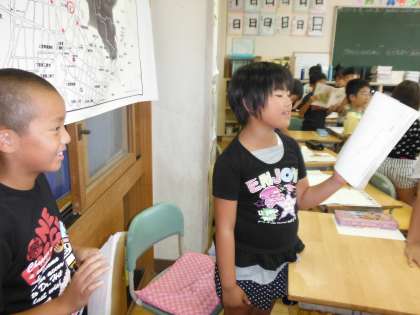 関西弁で書かれている詩の学習です。知っている関西弁が次々に出て楽しそうです。ペアで読みあって音読の練習をしました。