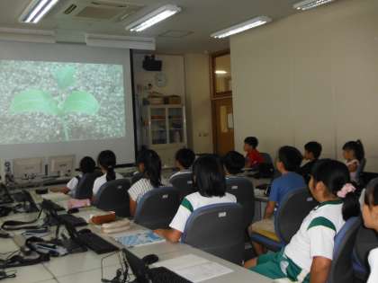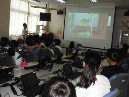 映像を見ながらツルレイシがこれまで育っていった様子を復習しています。ヘチマとツルレイシはとてもよく似ています。