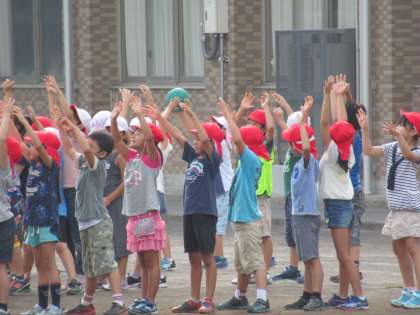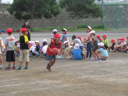 2年生は、校庭で、集会を開きました。ゲームは、メディシングボール。みんな、夢中で楽しみました。