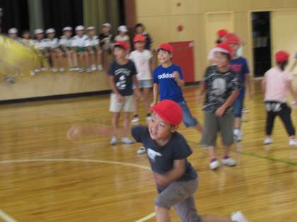 ボールを2個使ったドッジボールで、スリル満点!負けん気が強くて勝負ではもめることも多かった子どもたちが、ルールを守り潔く勝負する姿に成長を感じました。