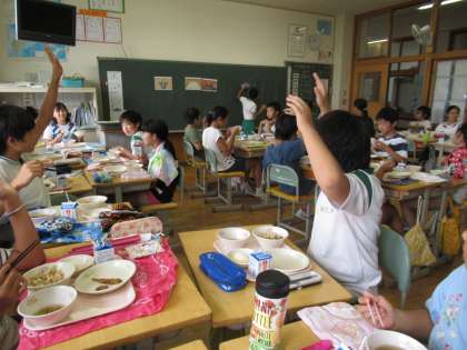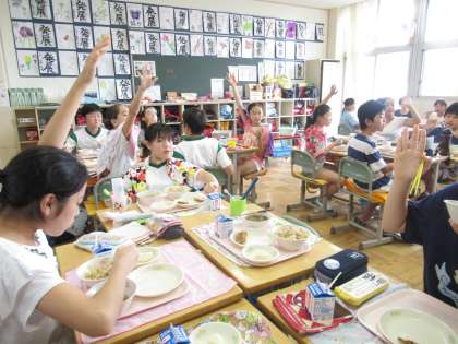 今日の昼休みは、新校舎の学年の子どもたちはロング休み時間です。6年生は、給食を食べながら、学級遊びの計画を立てていました。