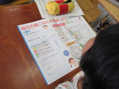 今回は、県から出されている「朝ごはん食べていますか?」のリーフレットも活用した授業です。朝ごはんを食べることが、元気に生活し学習や運動に取り組むために大切であることを知り、栄養バランスのとれた朝ごはんを食べようという気持ちを高めることがねらいです。