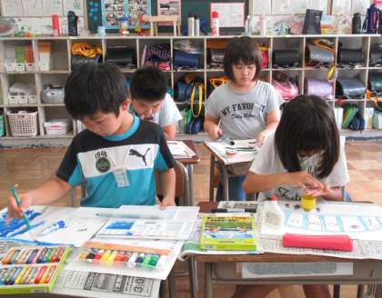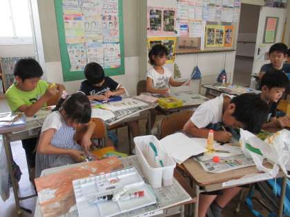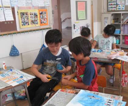 夏休みの心に残った出来事を、絵に表しています。モールや毛糸なども使って、工夫しています。