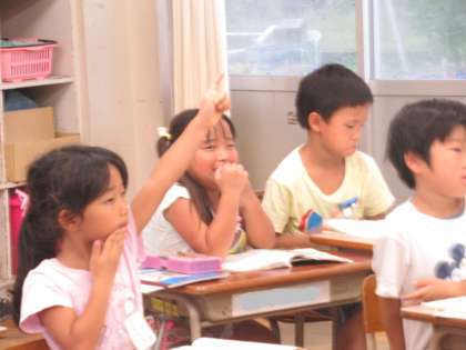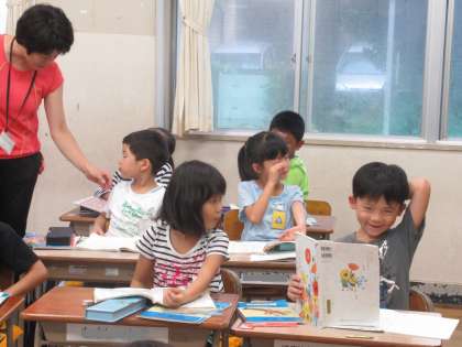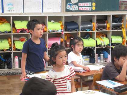 「みすぼらしい、おぼうさま」ってどんな様子か考えたとき、挿絵から「顔にシワがあるよ」と発言した子がいました。「シワって何?」「先生、シワある?」「校長先生、ある?見せて!」笑顔で話す素直な子どもたちに、先生二人で苦笑しました。