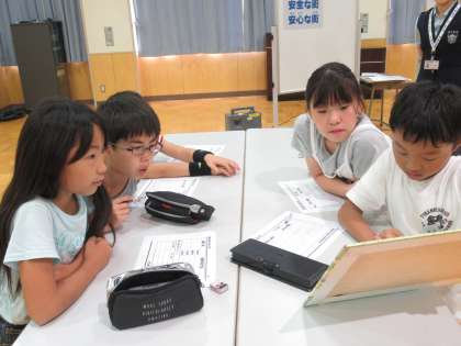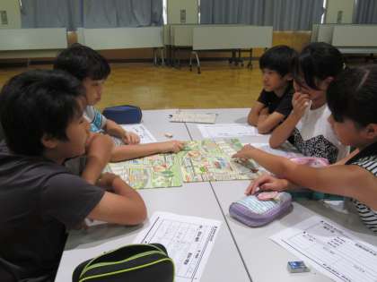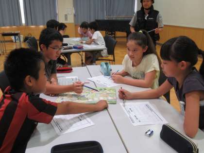 街の様子を描いた絵を見て、危険箇所を探しました。どこが危険? 何が危険? どうしたら改善できる? 班のみんなで、話し合いました。