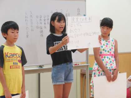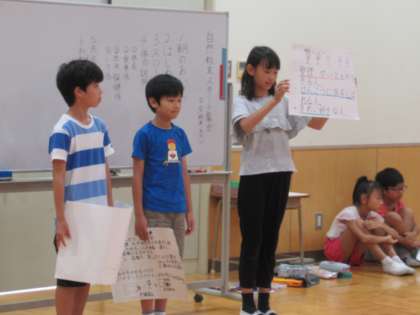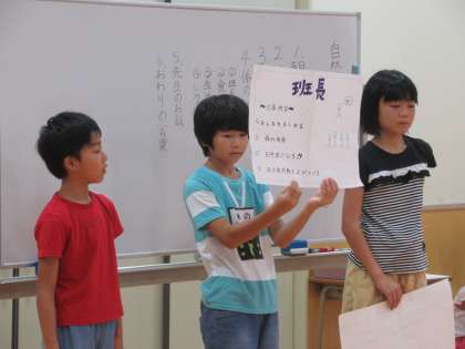 実行委員が、担当する係(班長・食事・保健・レク)ごとに、仕事の内容や求める人材を説明しました。聴いている子どもたちは、何係になろうか、わくわくした表情で聴いていました。