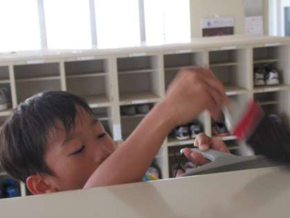 靴箱の上は、いすに乗ってはいています。落ちないように、気をつけて。