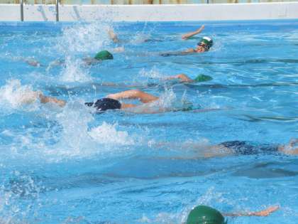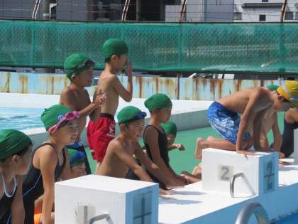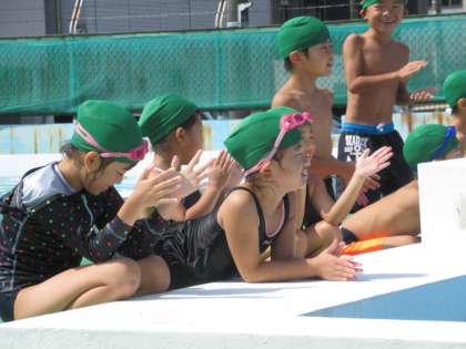 どれだけ泳げるか、大きなプールで挑戦しました。泳ぐ友だちを一生懸命応援する姿が、すてきです。