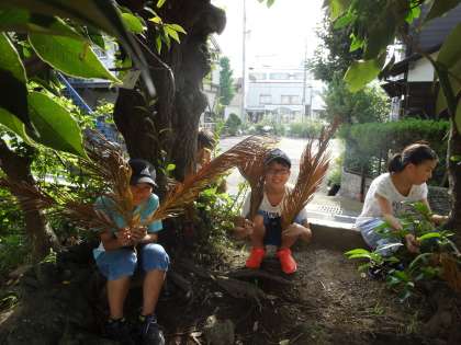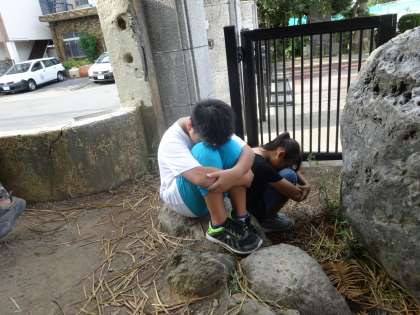 思い思いの場所で写真を撮った後は、「自然擬態かくれんぼ」を行いました。みんな、落ち葉などをうまく使ったり、岩になりきったりして、真剣に隠れていました。鬼が近付いても、身動きしないのは、さすが。「自然にとけこんでるから、セーフ」の子がたくさんいました。とても楽しかったです。