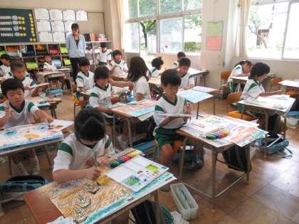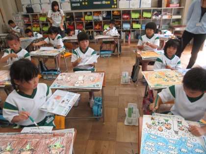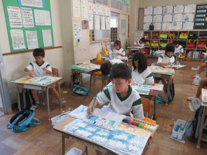 1年生は、どのクラスも図工でした。絵の具で思ったとおりの色をつくるのが、むずかしいけれど、おもしろいようです。