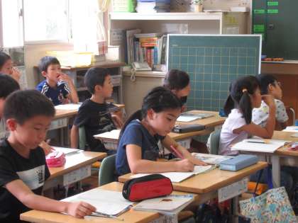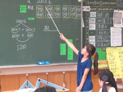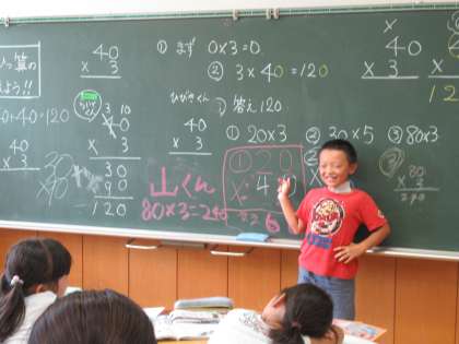3年生の算数は、少人数学習で行っています。定着の度合いに開きがあり、基礎的な力として確実に習得させたい「かけ算の筆算」は、3クラスを4つの集団に分けて、4つの教室で学習しています。