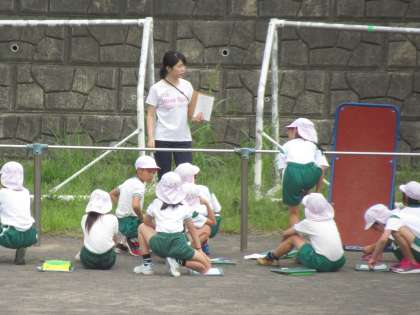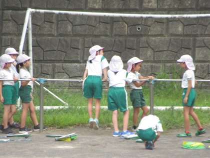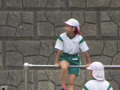 鉄棒の学習です。足かけ回りを練習していました。まず、友だちにお手本を見せてもらいました。