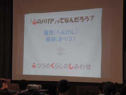 心のバリアフリー。心のバリアは、偏見や差別、それをなくすのが心のバリアフリーです。子どもたちは、熱心にメモを取りながら聴いていました。