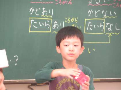 持ち寄った箱を班で分類して、立体の特徴をとらえる学習です。まよった形は、みんなで相談して、解決していきました。