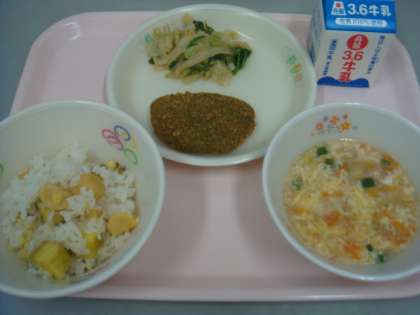 今日の給食は「さつまいもと栗のごはん・黒はんぺんのお茶フライ・ごま和え・かきたま汁・牛乳」でした。