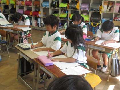 見つけた秋を、文にしました。先生が赤ペンを入れてくれたので、いよいよ清書します。真剣です。