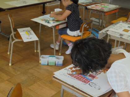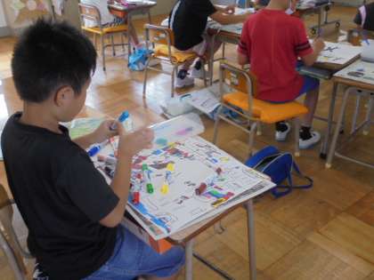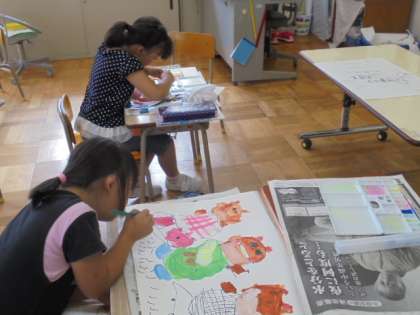 図工で、大好きな物語を描きました。もうすぐで完成ですね!