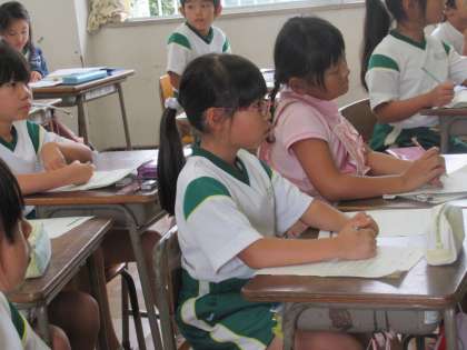 友だちの発表を聴いています。何を伝えたいのか集中して聴いて、記録カードに聴き取った内容を書いていきます。