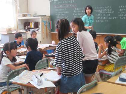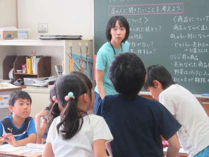 スーパー見学で発見したことともっと知りたいことを、話し合っていました。