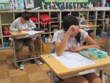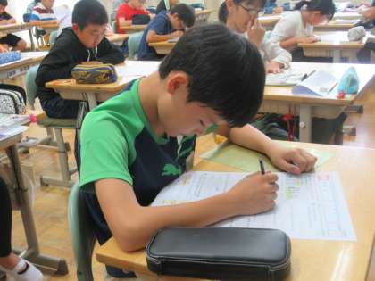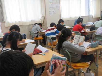 「速さ」のテスト中でした。最後まで見直しや確かめをして粘る子あり、完璧と見極めて読書に移る子あり。さあ、結果はいかに。