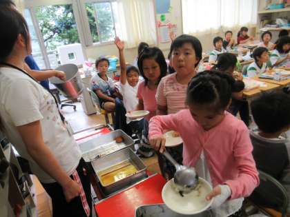 今日の給食では、二つ折りパンにメンチカツをはさんで食べました。付け合わせの野菜も、野菜たっぷりのスープも、おかわりしていました。月見団子の甘辛だれも、人気でした。