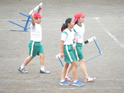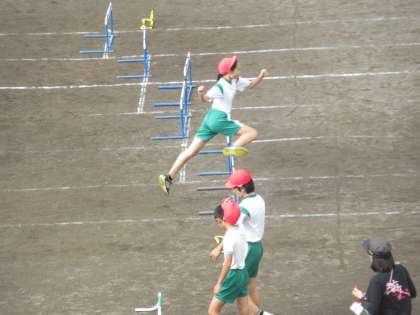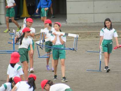 ハードル走に挑戦しています。準備も片付けも、みんなで協力します。