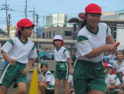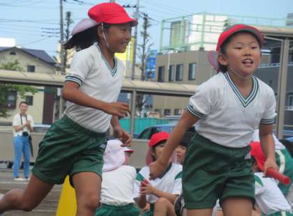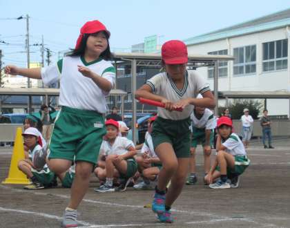 4年生は、声を掛け合いながら、バトンパスをしていました。