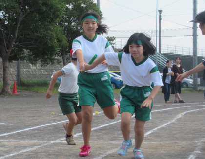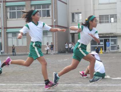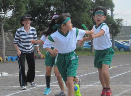 4年生は、声を掛け合いながら、バトンパスをしていました。