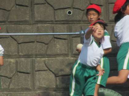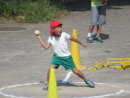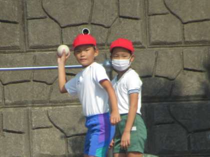 5,6年生の測定終了後、今度は3,4年生が新体力テストに挑戦しています。<ボール投げ>