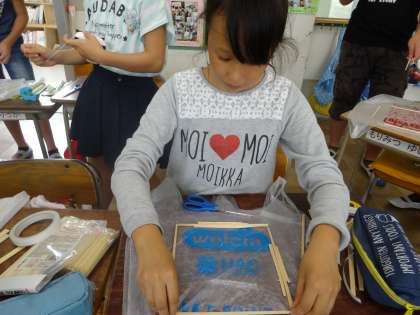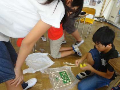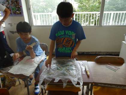 たこあげをしました。たこを作るところから始めます。ビニール袋やわりばし、たこ糸などを使って、一生懸命組み立て方を考えていました。