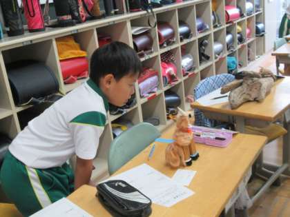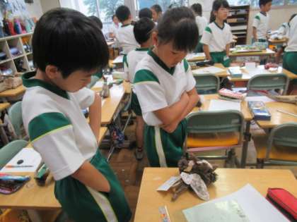 こちらの教室では、流木アートの作品を、友だちと見合っていました。