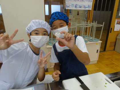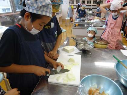 調理実習の様子です。目にしみても、がんばってたまねぎを切りました。具材によって、短冊切り、さいの目切り、うす切りなど切り方を工夫します。中には、当たりのハート型を2つだけ!なんていう班もありましたよ。