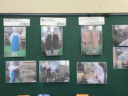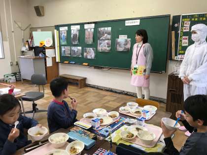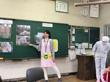 栄養教諭の鈴木先生と調理員さんがいらっしゃって、給食室での仕事についてお話しして下さいました。先日、町探検で地域のお店の方々にインタビューしたばかりだったので、それを活かして気になったことをたくさん質問していました。